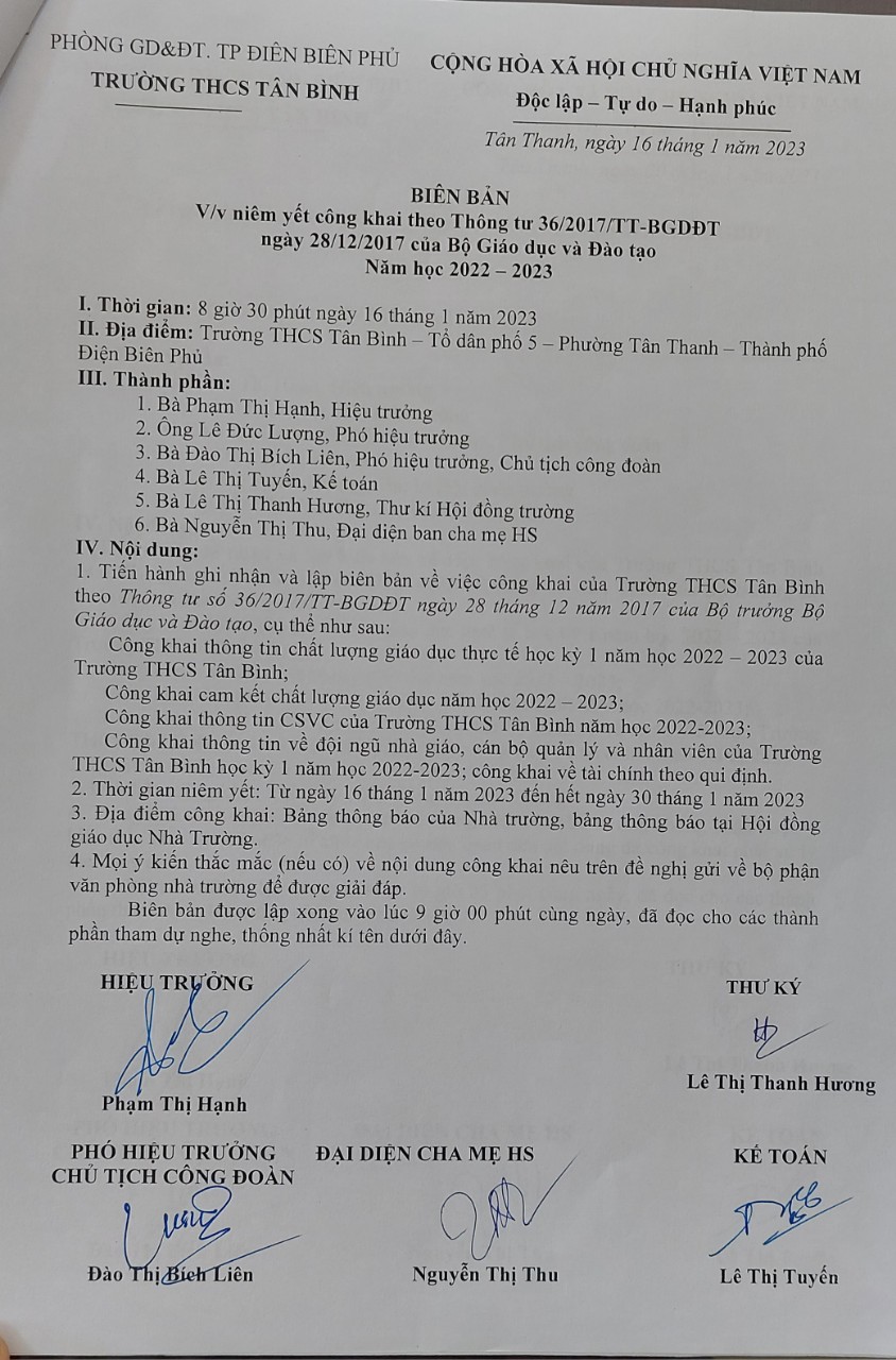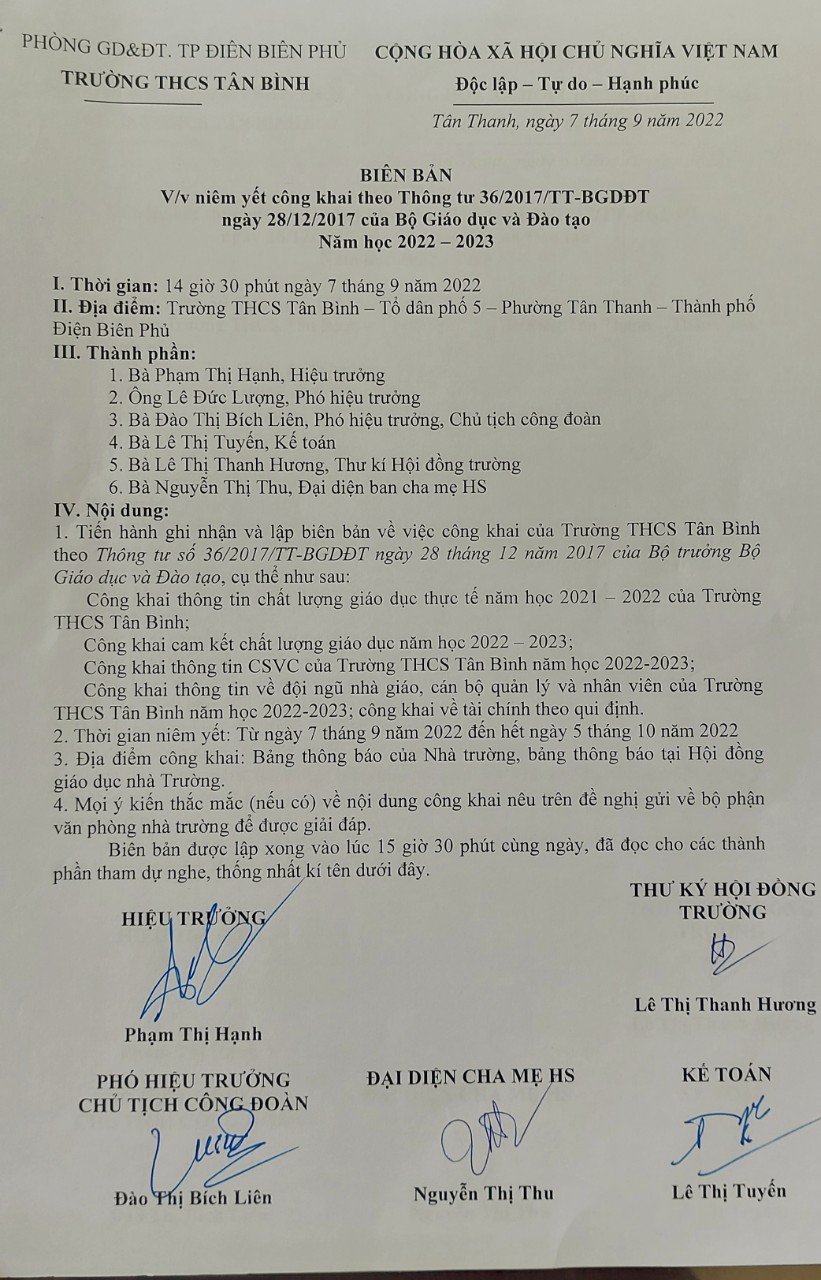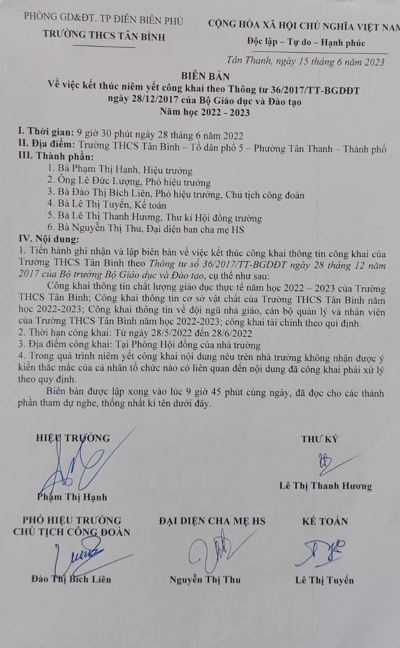 THÔNG BÁO Cam kết chất lượng giáo dục của trường THCS Tân Bình năm học 2022-2023.